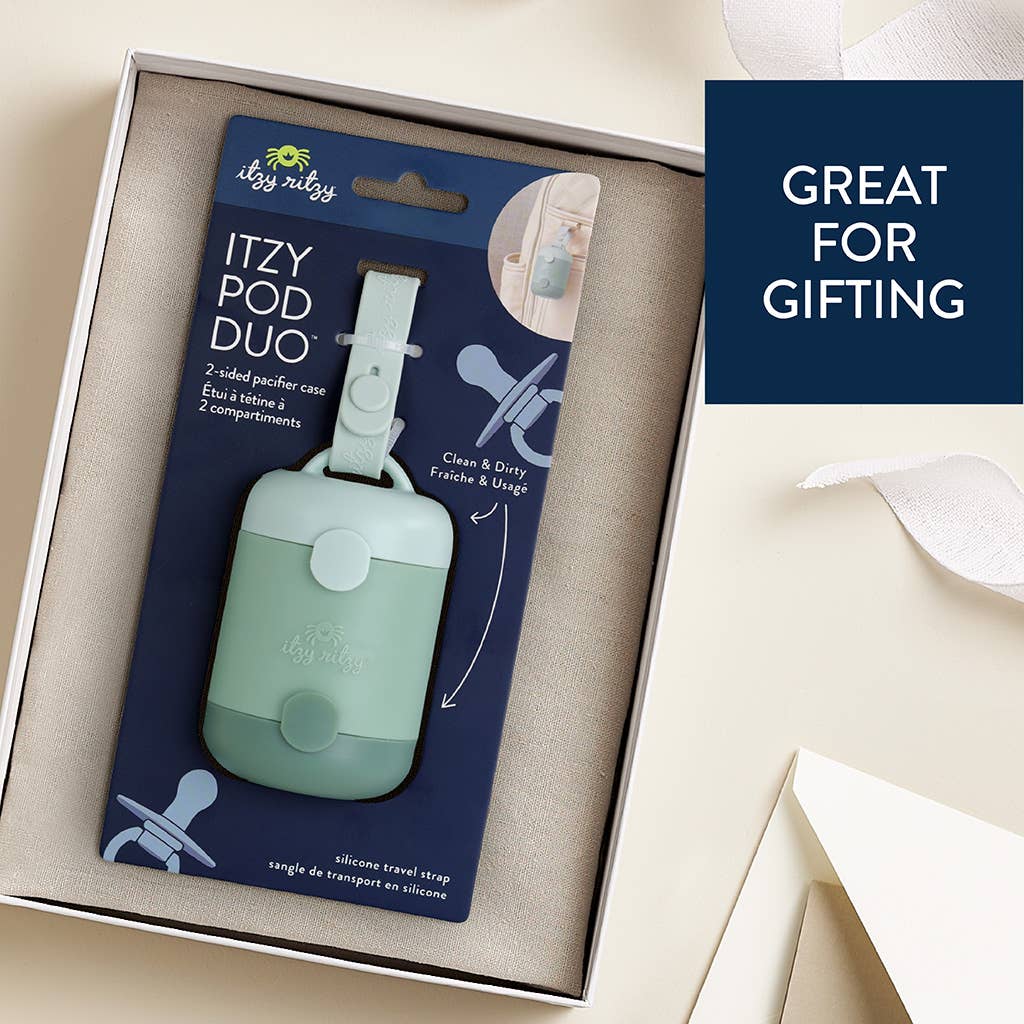 Keep Clean & Dirty Pacis Apart! Ensure clean and dirty pacis go their separate ways with the Itzy Pod Duo™ pacifier case. Featuring two easy-open storage compartments, this essential accessory easily attaches to diaper bags or strollers with a silicone strap.