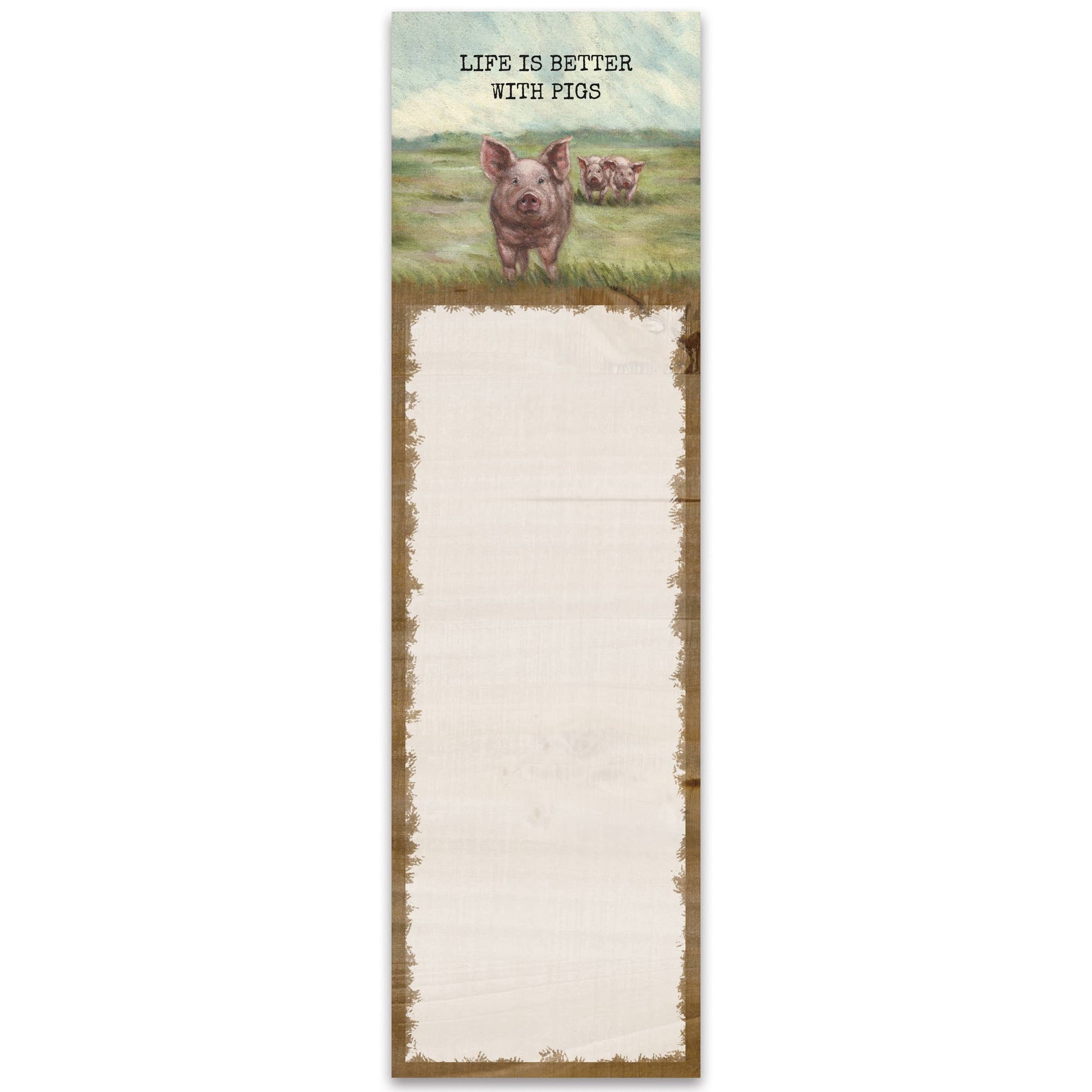 A list notepad from our Farmhouse Collection displaying a charming scene of farm pigs in a field with a farm inspired sentiment that reads "Life Is Better With Pigs" and a decorative space underneath for writing. Pig design is replicated from original artwork painted onto burlap canvas, giving the art a unique depth and texture. Our Better With Pigs list pad includes 60 pages and a strong magnet to easily hang on magnetic surface for display. Proudly made in the USA. A fun farm-themed gift perfect for adding functional style to any space.