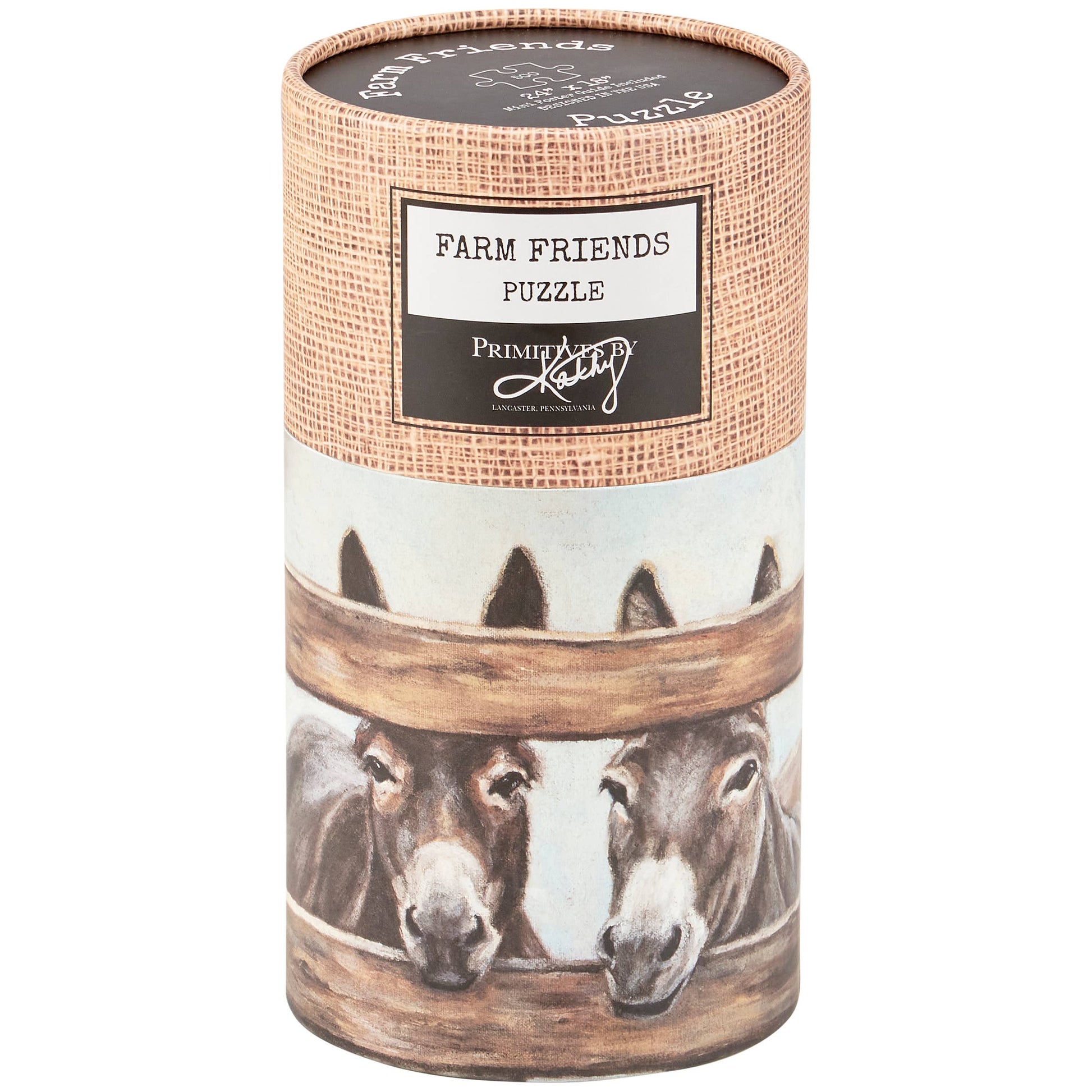 A 500 piece puzzle from our Farmhouse Collection displaying a charming scene of two donkeys peeking through a fence. Design is replicated from original artwork painted onto burlap canvas, giving the art a unique depth and texture. Puzzle pieces are packaged in a resealable plastic bag and enclosed in a cylindrical box with the design displayed around outside and a descriptive "Farm Friends Puzzle" sentiment on lid. Our Donkey puzzle includes a printout of full puzzle image for reference. Contains small parts; this is not a toy. A farm-themed accessory great for everyday gifting.