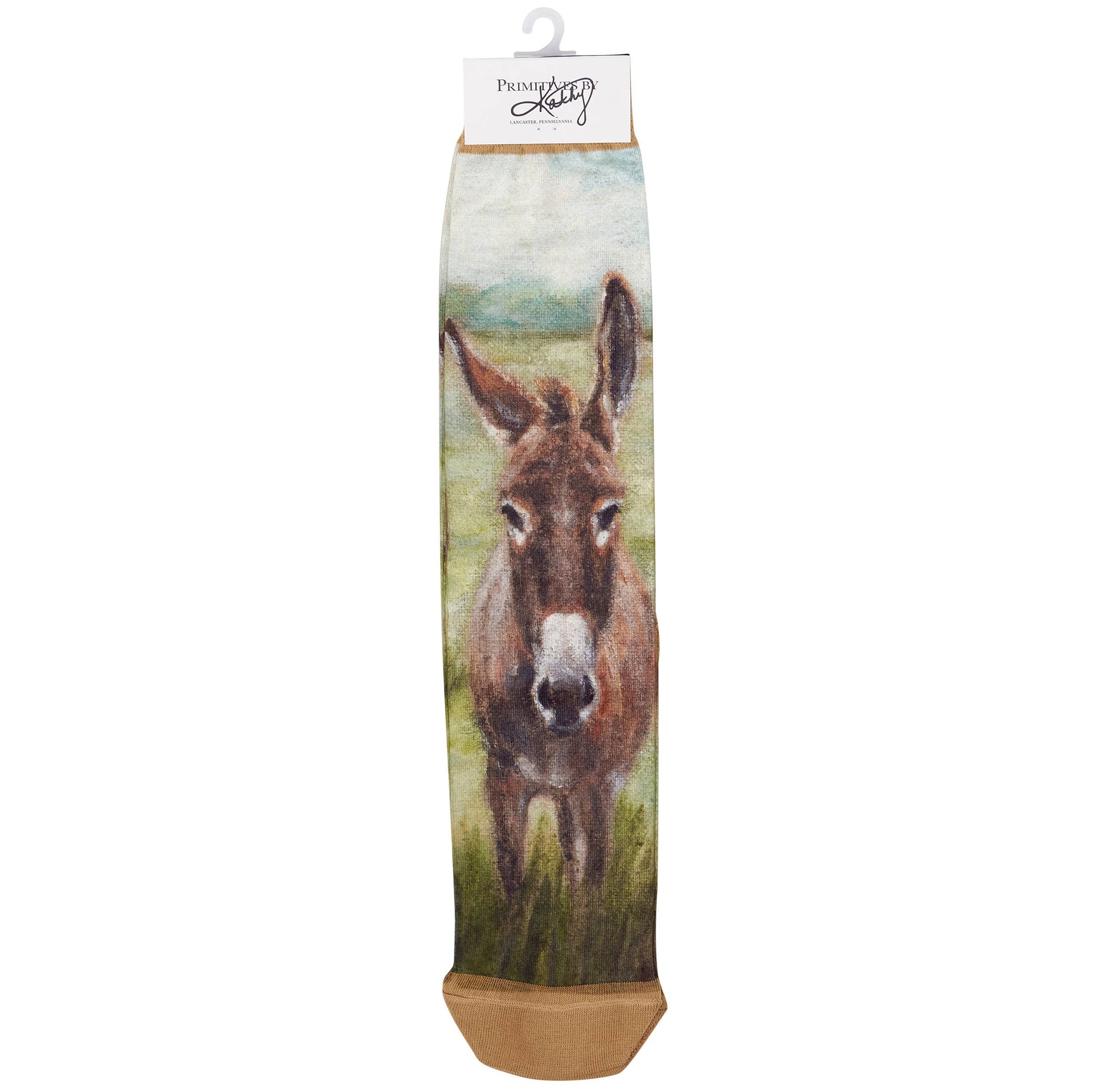 A pair of colorful knee-high socks from our Farmhouse Collection displaying a hand painted design of donkeys in a field on each sock. Donkey design is digitally printed replicating original artwork painted onto burlap canvas, giving the art a unique depth and texture. These giftable socks feature a knee-high length to easily show off the full design made with a spandex blend for a one size fits most design. A charming farm-themed gift perfect for everyday self-expression.