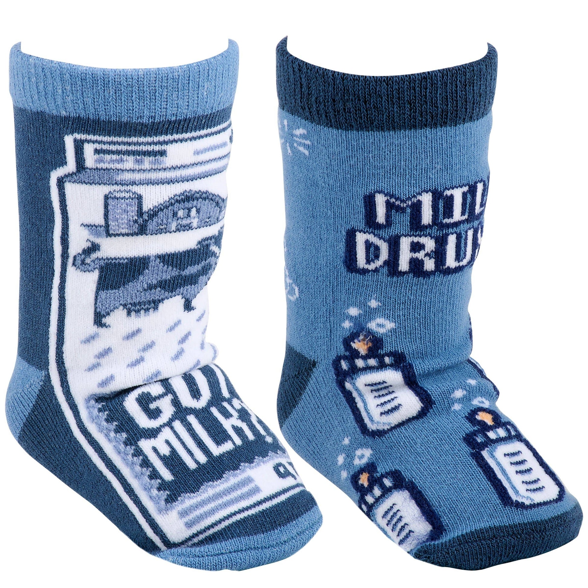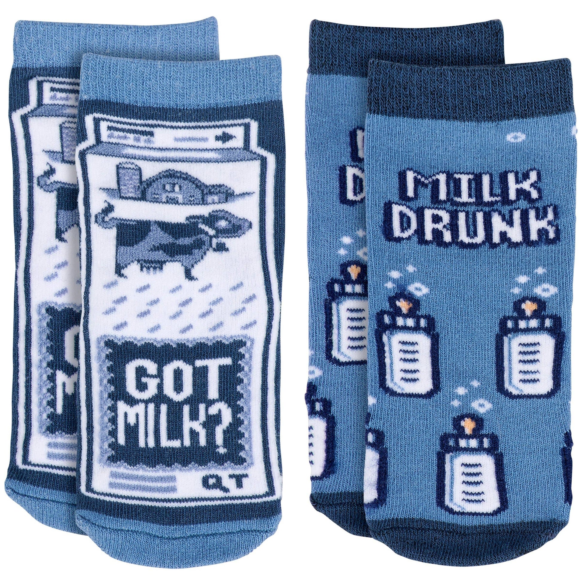 Two pairs of cozy baby socks in a giftable set from our Baby & Kids Collection displaying funny milk-themed designs on each pair. Baby socks feature a fun milk carton design with "Got Milk?" sentiment as well as a pattern of baby bottles with fun sentiment that reads "Milk Drunk." Both baby sock designs are replicated from original hand illustrated art. Socks are sized to fit a 0-12 month baby and made with a cotton, nylon, and spandex blend for a snug fit. A fun gift for baby showers or everyday moments.