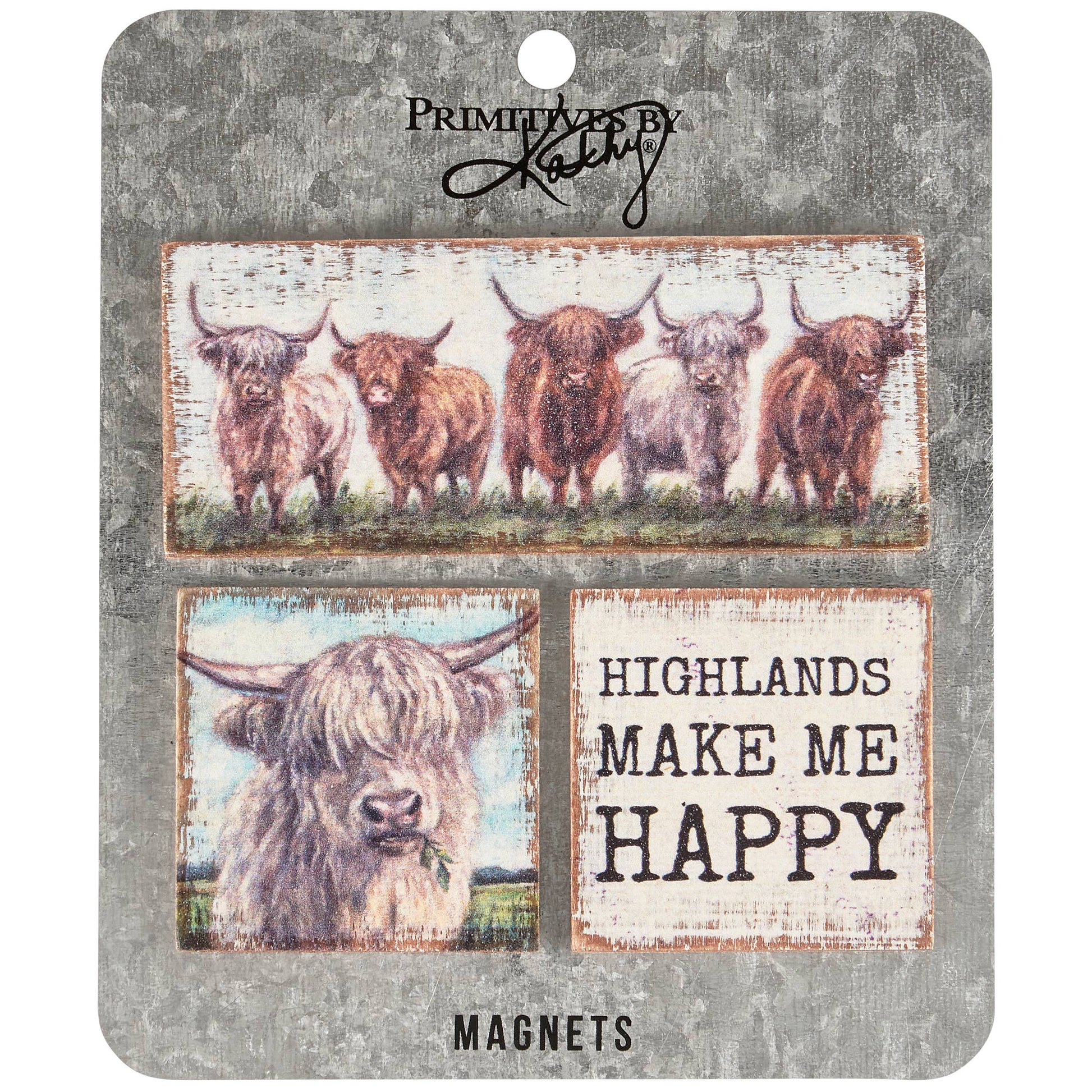 A set of three wooden magnets from our Farmhouse Collection displaying hand painted scenes of highland cows and one with a sentiment that reads "Highlands Make Me Happy." Designs are replicated from original artwork painted onto burlap canvas, giving the art a unique depth and texture. A gift set of rustic farm-themed home accents with a variety of display options.