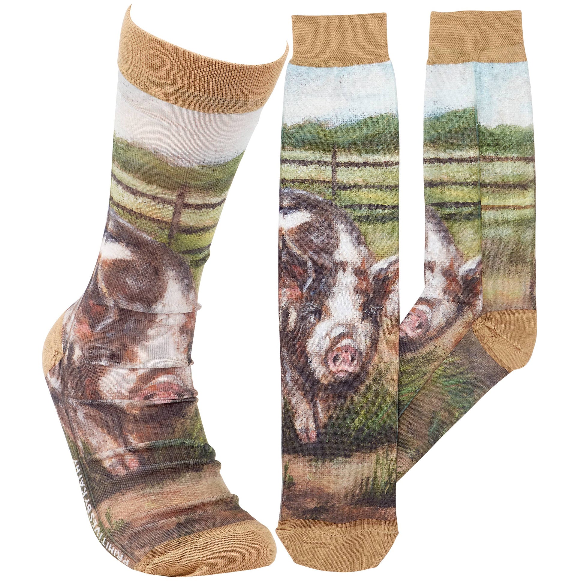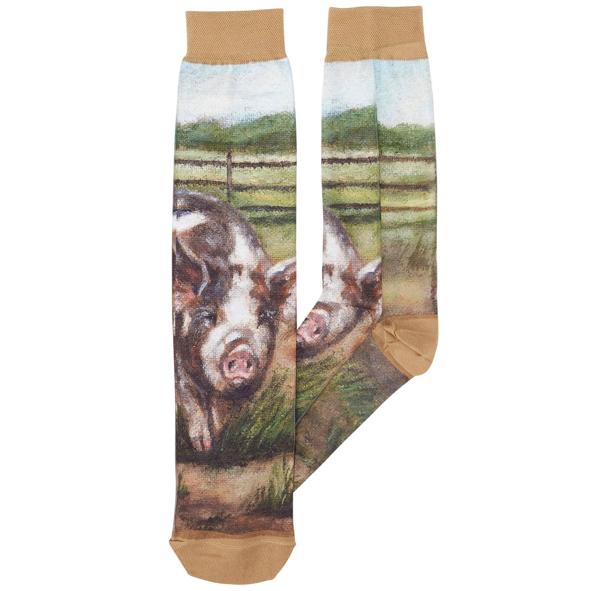 A pair of colorful knee-high socks from our Farmhouse Collection displaying a hand painted design of kune kune pigs in a pen on each sock. Pig design is digitally printed replicating original artwork painted onto burlap canvas, giving the art a unique depth and texture. These giftable socks feature a knee-high length to easily show off the full design made with a spandex blend for a one size fits most design. A charming farm-themed gift perfect for everyday self-expression.