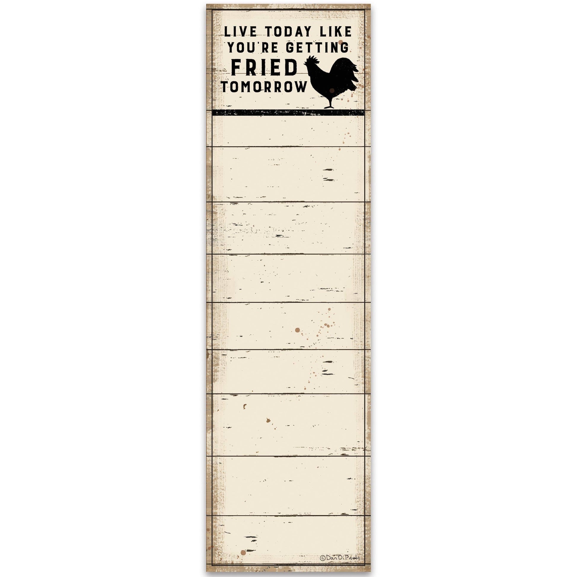 A list notepad from our Farmhouse Collection displaying a rustic design of a chicken with a fun farm inspired sentiment that reads "Live Today Like You're Getting Fried Tomorrow" and a decorative lined space underneath for writing. Our Live Today list pad includes 60 pages and a strong magnet to easily hang on magnetic surface for display. Proudly made in the USA. A rustic farm-themed gift perfect for adding functional style to any space.