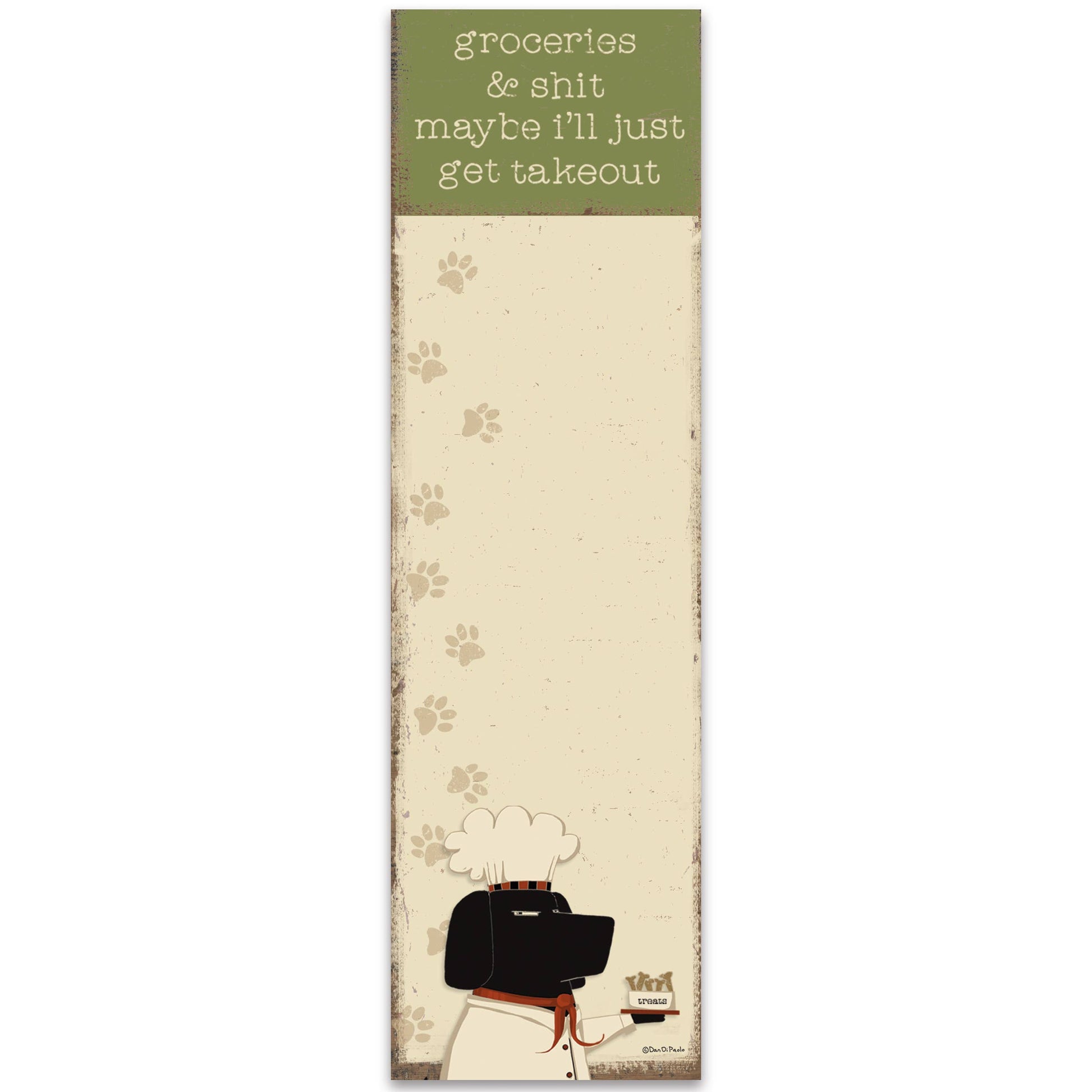 A list notepad from our Pet Collection displaying a rustic design of a dog in a chef outfit holding treats with a sassy sentiment that reads "Groceries & Shit - Maybe I'll Just Get Takeout" as well as decorative space to write. Our Maybe I'll Just Get Takeout list pad includes 60 pages and a strong magnet to easily hang on magnetic surface for display. Proudly made in the USA. A fun pet-themed gift perfect for adding functional style to any space.