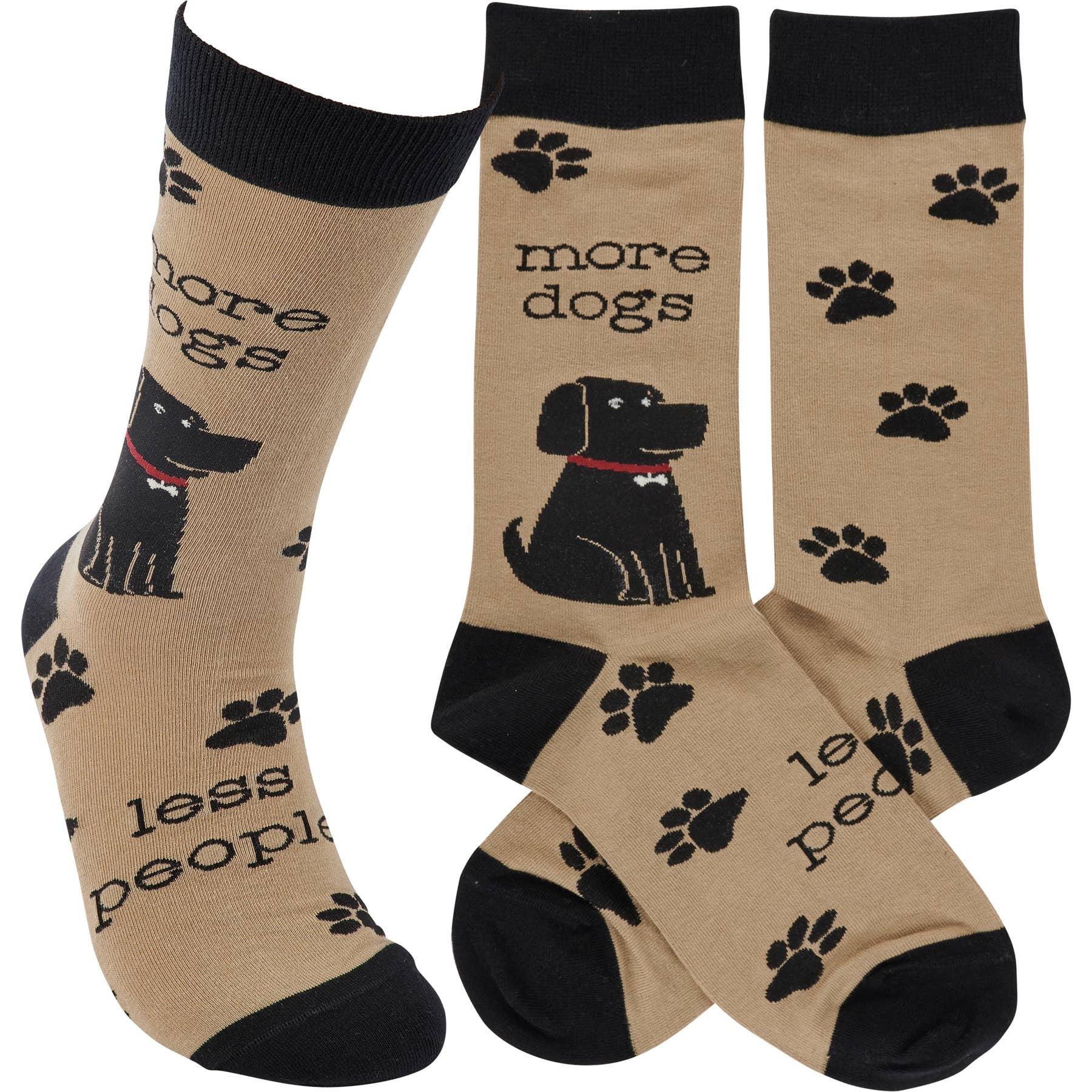 A pair of colorful woven socks from our Pet Collection displaying a rustic design of a happy dog and pawprints with "More Dogs Less People" sentiment. Socks feature a one size fits most design made with cotton, nylon, and spandex. A fun everyday accessory perfect for self-expression or gifting on any occasion.