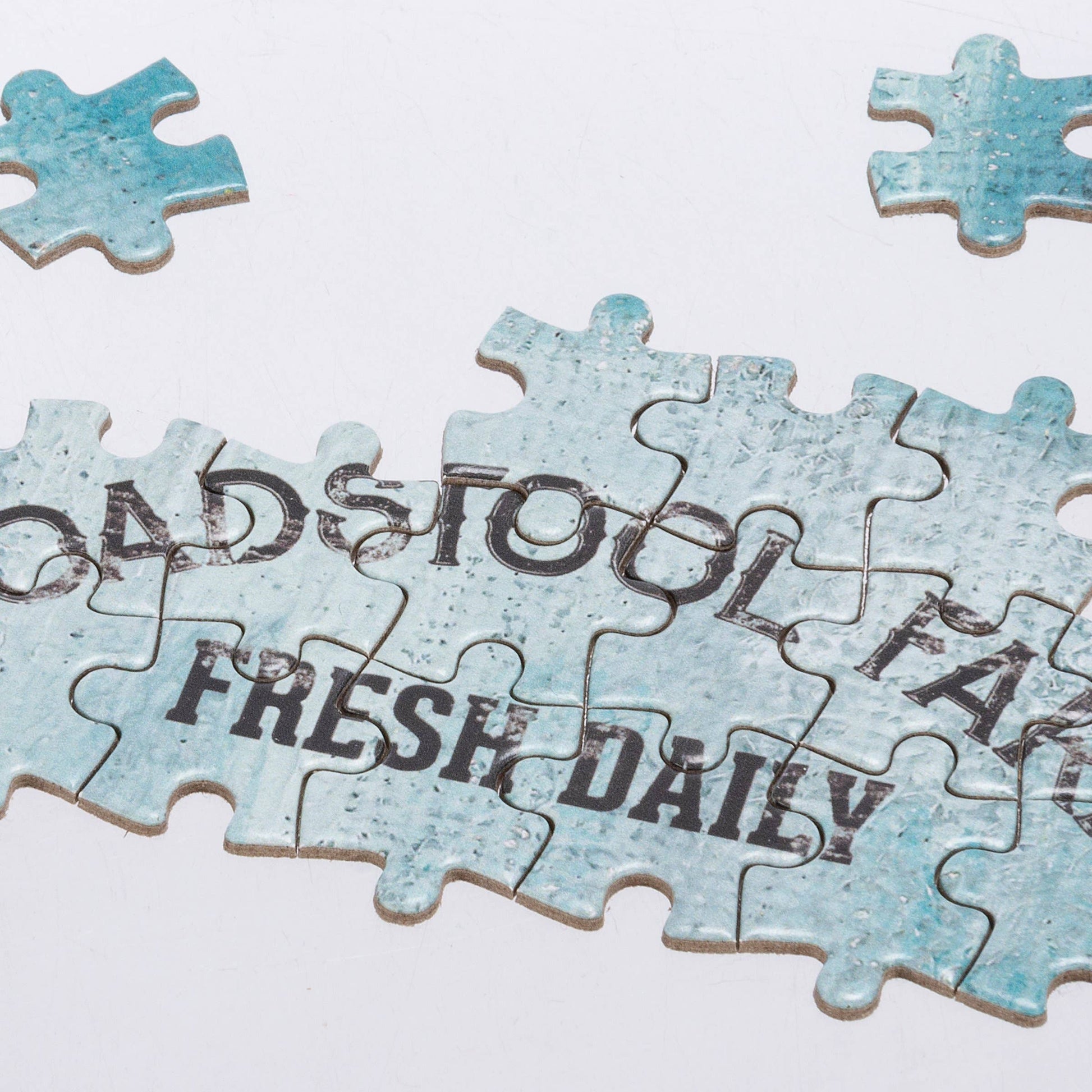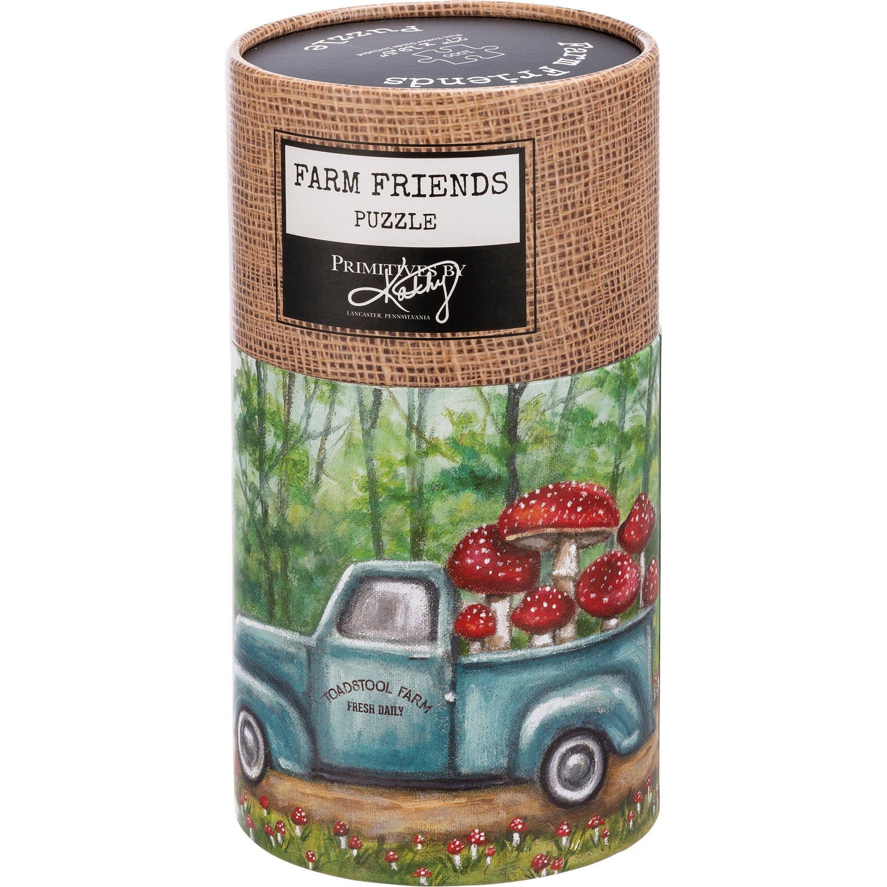 A 1,000 piece puzzle featuring a truck hauling mushrooms design. Design is replicated from original artwork painted onto burlap canvas, giving the art a unique depth and texture. Puzzle pieces are packaged in a resealable plastic bag and enclosed in a cylindrical box with the design wrapped around and a descriptive "Painted Farm Puzzle" sentiment on lid. Includes 10" x 8" printout of full puzzle image for reference.