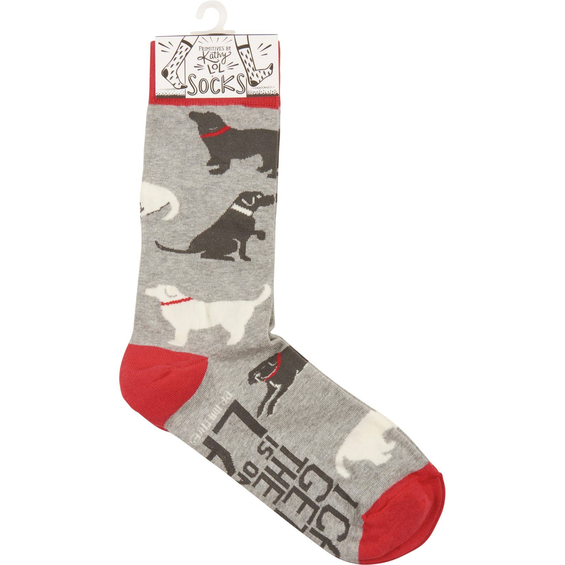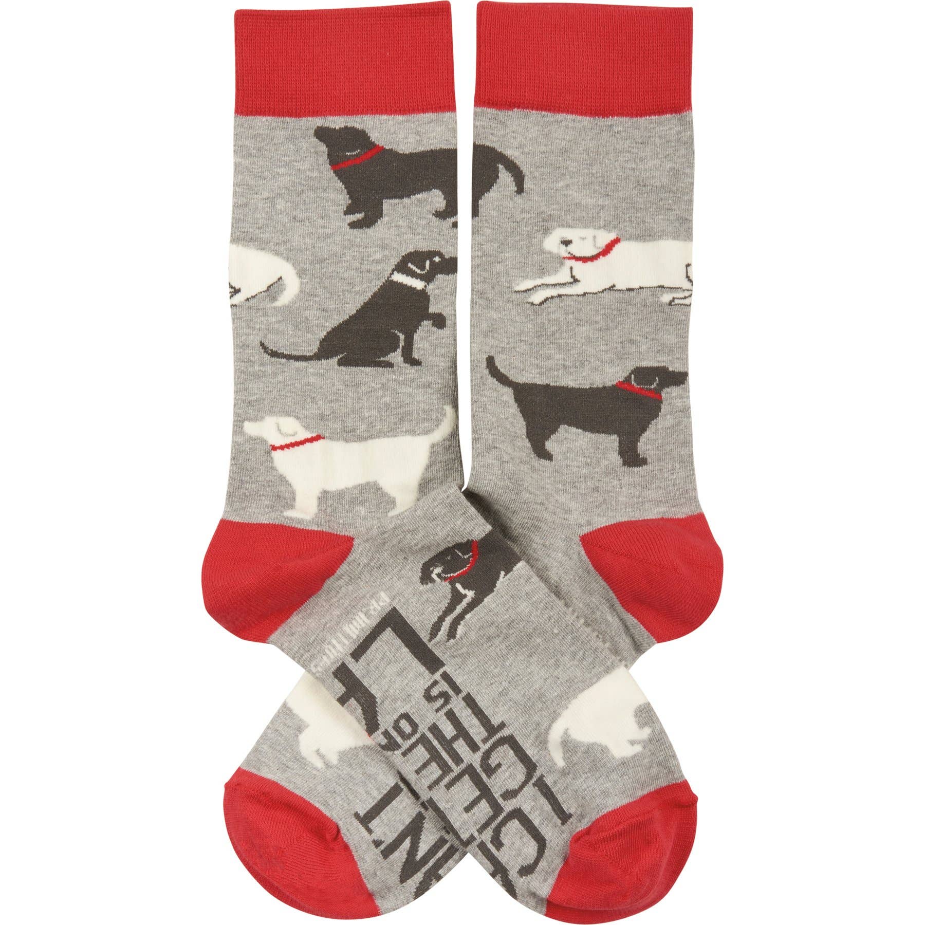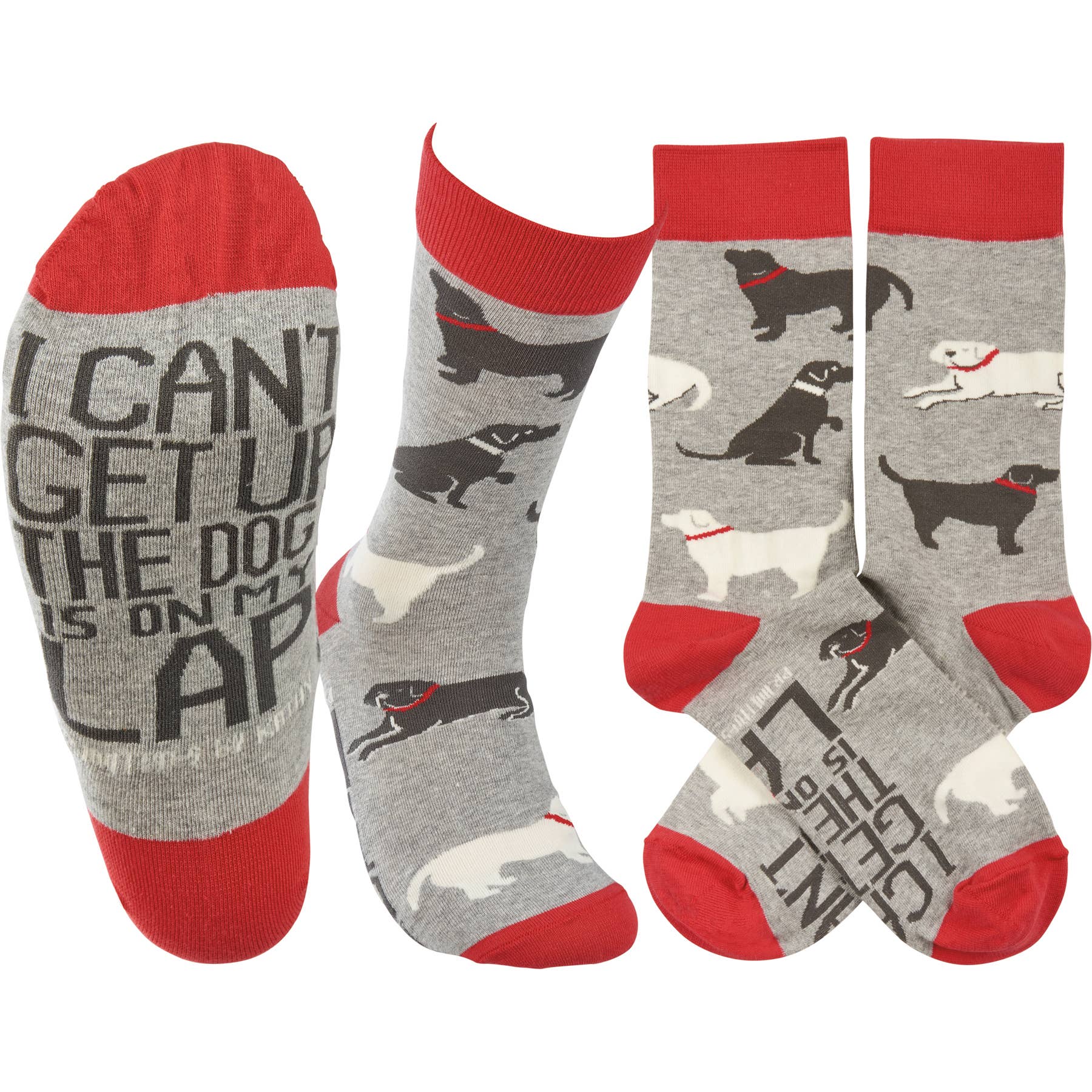A pair of colorful woven socks from our Pet Collection displaying hand illustrated designs of various dogs with "I Can't Get Up The Dog Is On My Lap" sentiment on the bottom of the socks. Socks feature a one size fits most design made with cotton, nylon, and spandex. A fun everyday accessory perfect for self-expression or gifting on any occasion.