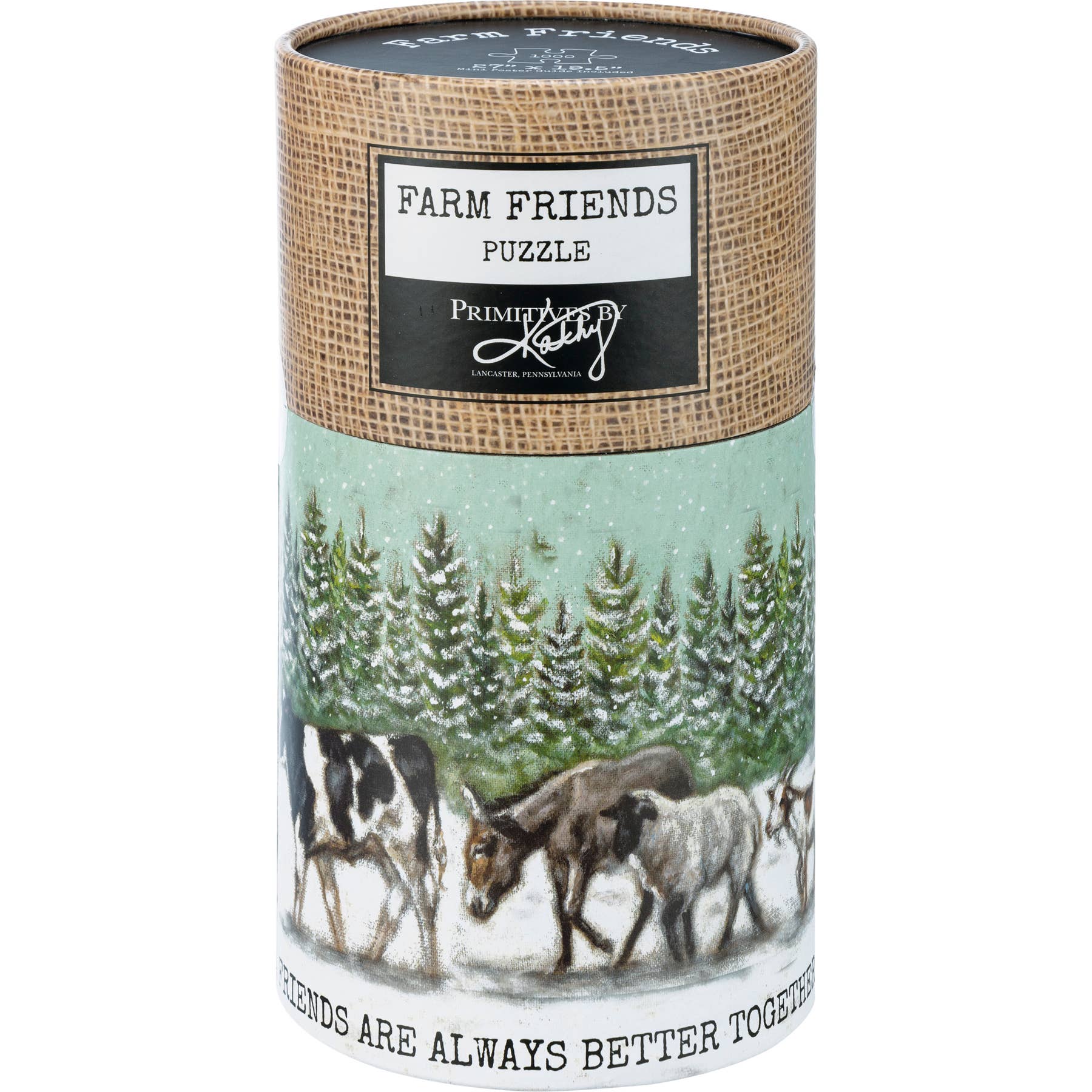 A 1,000 piece puzzle featuring a wintry farm animal design and "Friends Are Always Better Together" sentiment. Design is replicated from original artwork painted onto burlap canvas, giving the art a unique depth and texture. Puzzle pieces are packaged in a resealable plastic bag and enclosed in a cylindrical box with the design wrapped around and a descriptive "Farm Friends Puzzle" sentiment on lid. Includes 10" x 8" printout of full puzzle image for reference.