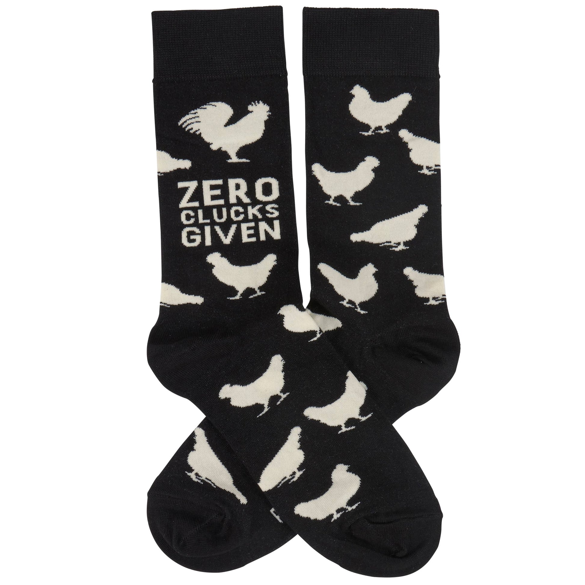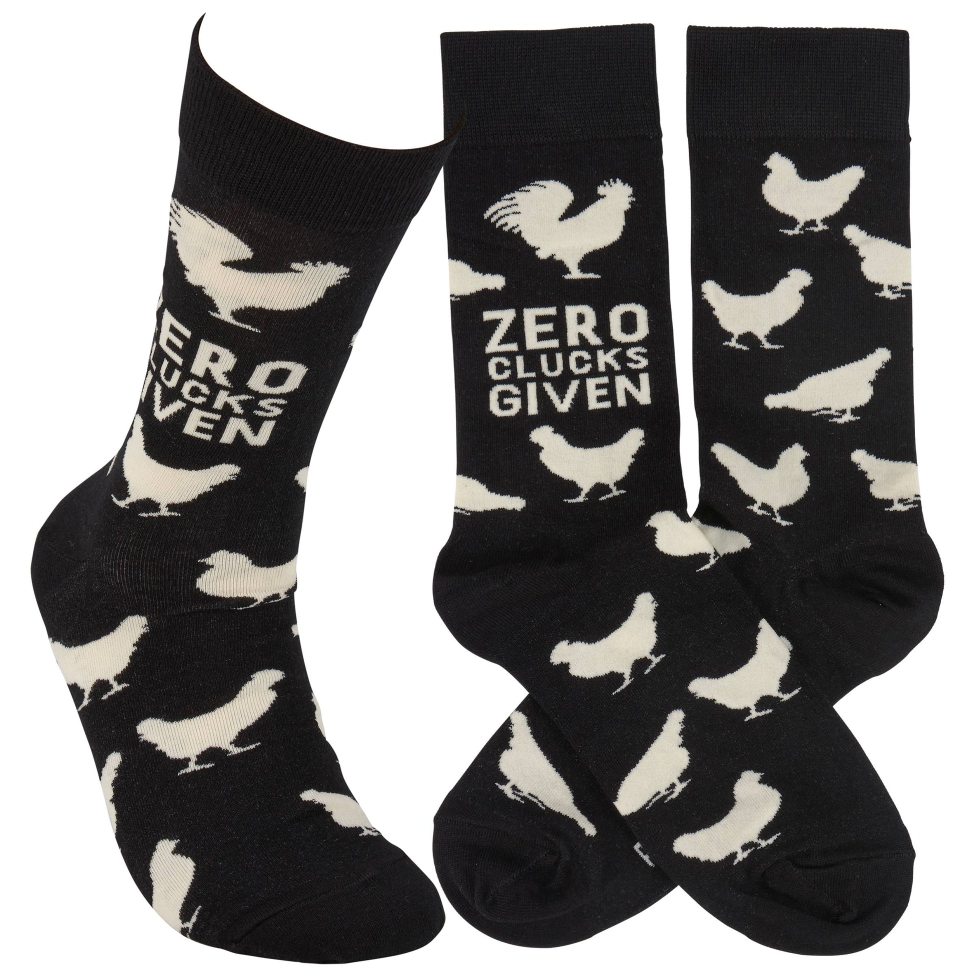 A pair of black and white socks from our Farmhouse Collection displaying various chicken and rooster designs with a farm inspired sentiment that reads "Zero Clucks Given." Socks feature a one size fits most design made with cotton, nylon, and spandex. A fun farm-themed gift perfect for everyday self-expression.