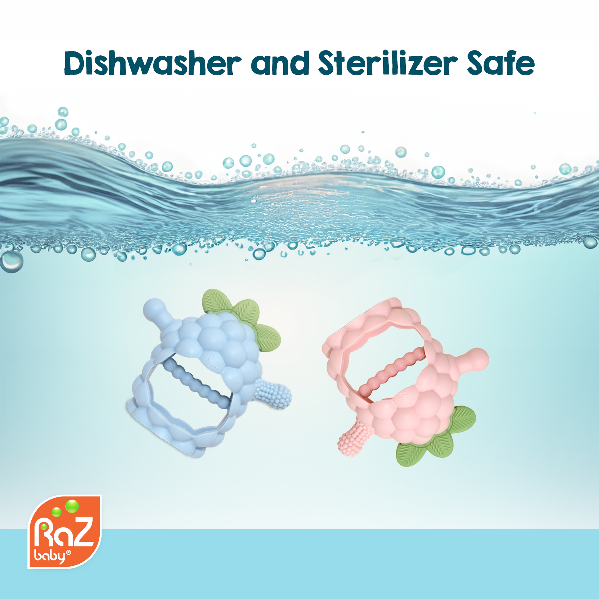 EASY TO CLEAN: Sterilize our RaZberry teething toys in boiling water for 5 minutes before first use, then rinse in between subsequent uses. Our teethers are durable and they make great baby shower gifts for a boy or girl! Comfort: We’ve designed our teethers with your baby’s comfort in mind. The silicone teether mitten is ergonomically comfortable for relief from sore gums and easy holding.